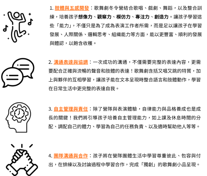 - 身心潛能開發:藉由音樂、舞蹈、戲劇等方式,幫助孩童學習轉化思維,提升情緒覺察,培養危機處理及自我管理能力,用積極正面的態度感覺生活,並學習整合創意展現、認知發展、語言表達、團隊合作!