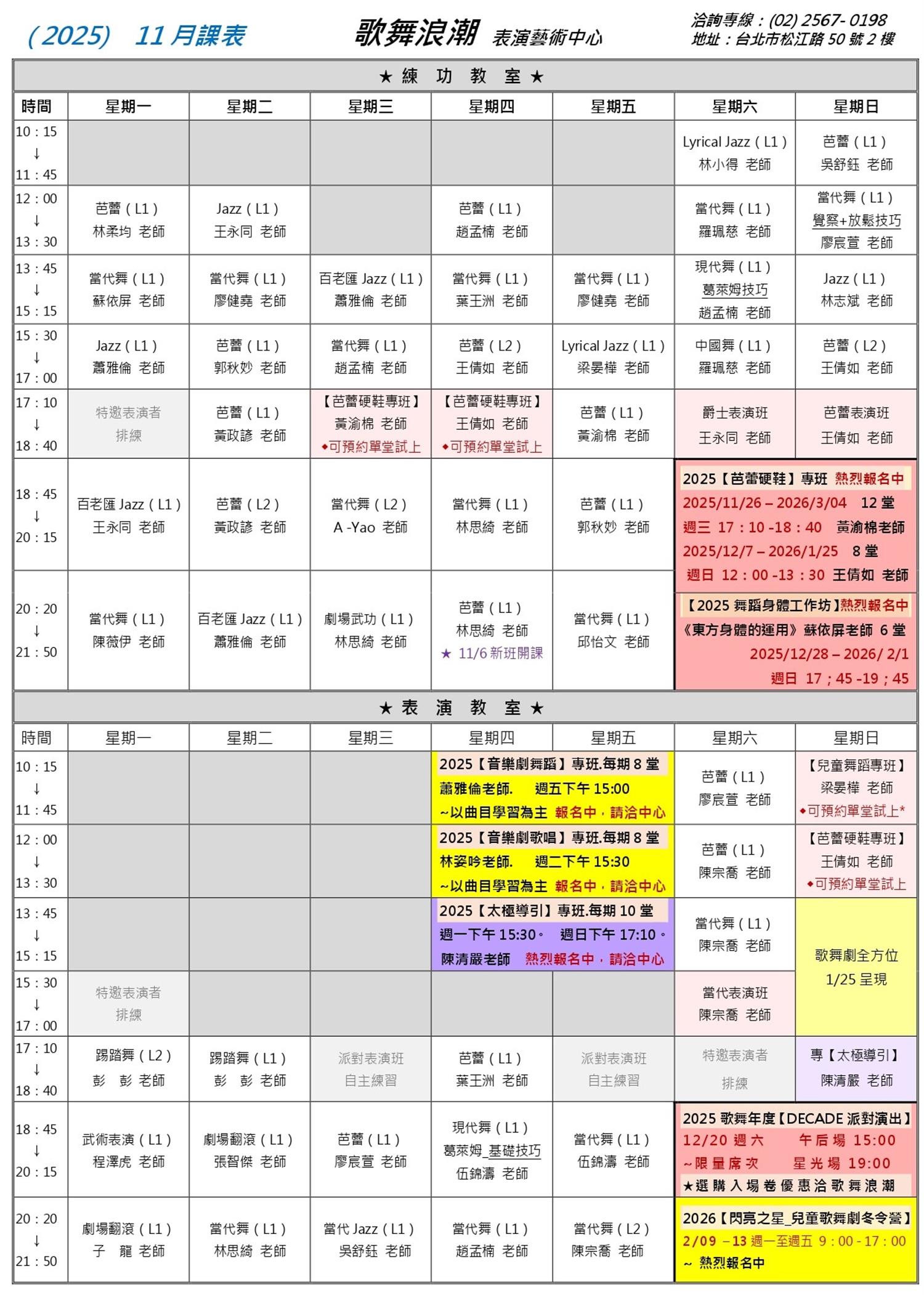 | 13:45 | 90分鐘 當代舞 初階 L1 蘇依屏 老師 會員價500元 單堂體驗 | 90分鐘 當代舞 初階 L1 廖健堯 老師 會員價430元 單堂體驗 | 90分鐘 百老匯JAZZ 初階 L1 蕭雅倫 老師 會員價460元 單堂體驗 | 90分鐘 當代舞 初階 L1 葉王洲 老師 會員價500元 單堂體驗 ★ 新班開課 | 90分鐘 當代舞 初階 L1 廖健堯 老師 會員價430元 單堂體驗 | 90分鐘 當代舞 初階 L1 陳宗喬 老師 會員價460元 單堂體驗 葛萊姆 基礎技巧 初階 L1 趙孟楠 老師 會員價430元 單堂體驗 | 240分鐘 2025歌舞劇全方位專班11月:Wicked 初階 L1 伍錦濤 老師 會員價25,500元 第4堂/共12堂 ★ 13:30 上課 Jazz 初階 L1 林志斌 老師 會員價500元 單堂體驗 ★ 新班開課! |